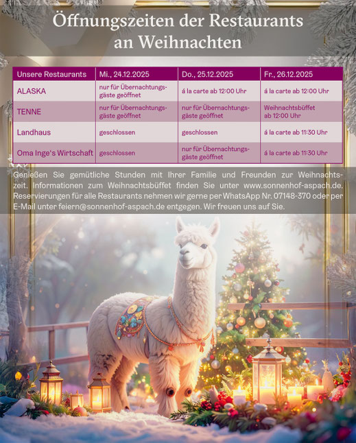 Liebe Gäste. Sie wollen eines unserer Restaurants besuchen? Wir bitten daher um Tischreservierung. Diese können Sie gewohnt telefonisch, über unsere Website und nun auch per WhatsApp vornehmen.