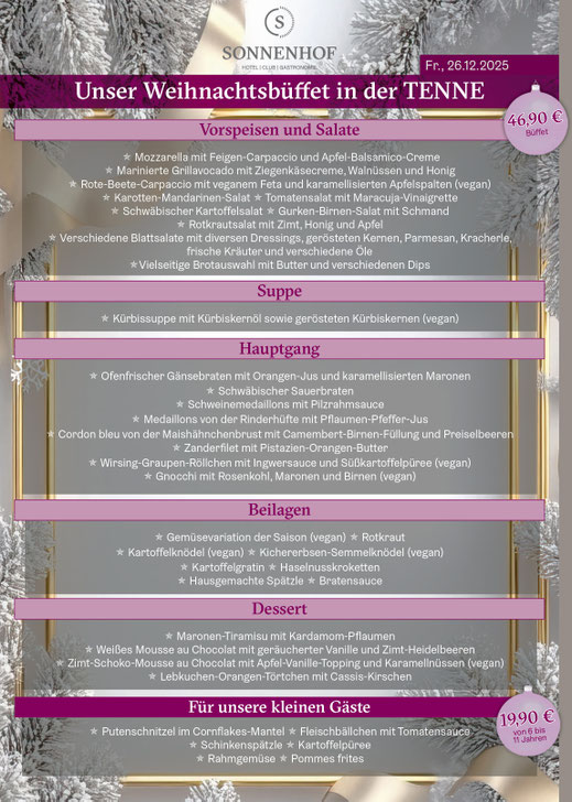 Das damalige Restaurant, die "Sonnenhofstuben", ist heute unser Restaurant "Stadl". Seit 1982 besteht nun schon das urige kleine Restaurant, in dem zünftige regionale Speisen serviert werden und hausgemachte, sündhaft leckeren Kuchen und Torten aus der angrenzenden Backstube serviert werden. Eines von vielen großen Projekten wurde 1997 eröffnet: das "Alaska-Restaurant" mit der angrenzenden Panorama-Terrasse. Das Alaska-Restaurant im außergewöhnlichen Ambiente des original kanadischen Blockhauses begeistert Sie mit kulinarischen Kreationen und raffinierten Ausflügen in die Küchen der Welt und bodenständig regionalen Traditionsgerichten. 8 Jahre später entstand das wunderschöne "Landhaus am Sonnenhof" mit dem typisch im Landhausstil gehaltenen Restaurant "Kaminstüble" und dem "Weinbergstüble" sowie dem schönen Außenbereich, wo der Streichelzoo angrenzt. Sorgfältig aufgearbeitetes Altholz, antike Schränke und Uhren, die wohlige Wärme des Kachelofens und Familienfotos aus 60 Jahren Gasthaustradition prägen die Atmosphäre dieses Restaurants. Sie genießen einen faszinierenden Ausblick auf gemütlichen Lounge-Inseln im Garten, auf der Terrasse oder im Wintergarten. Am 1. April 2015, genau 65 Jahre nach der Eröffnung der Gaststätte „Sonne“ im Jahr 1950, öffnet „sDörfle“. Zur Erinnerung an die Ursprünge des Hotel Sonnenhof gibt es im Dörfle das "Wirtshaus Sonne". Im selben Jahr eröffneten wir das Restaurant "Tenne".