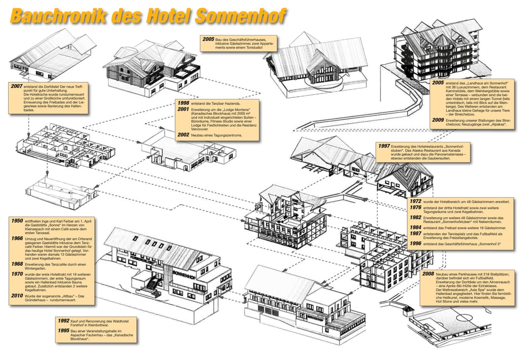 Sie sehen, liebe Gäste, die Geschichte des Sonnenhofs lässt sich nicht in wenigen Worten fassen. In diesen 75 Jahren entwickelte sich aus der „Sonne“ ein weitläufiges Areal, das für 600